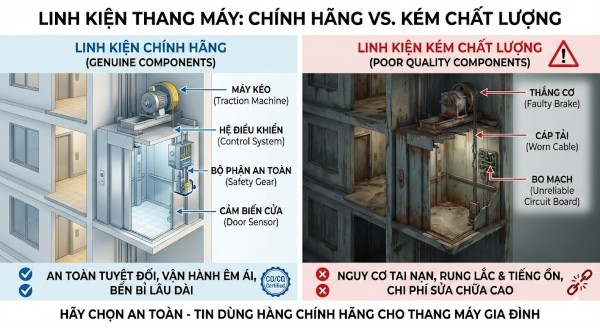 - Tiếng ồn lớn và vận hành kém êm ái: Linh kiện không đồng bộ hoặc không đúng thông số kỹ thuật từ nhà sản xuất sẽ gây ra tình trạng rung lắc, phát ra tiếng kêu khó chịu bên trong cabin, làm giảm đáng kể trải nghiệm thoải mái khi di chuyển trong chính ngôi nhà của bạn.